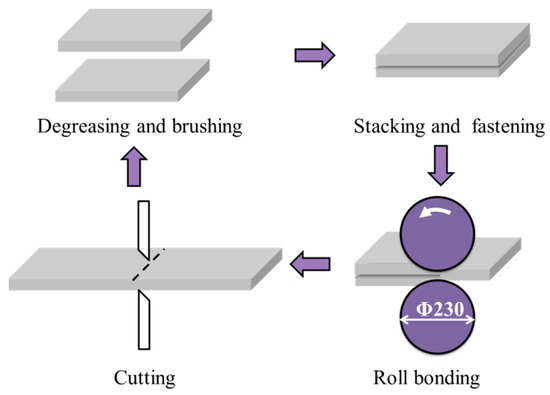 Initially, the sheets were degreased using acetone and then brushed to achieve a clean surface. Following the preparation, the sheets were stacked so that their roughened surfaces made contact with each other, and then they were fastened together at one end. The rolling process was performed on a laboratory rolling mill consisting of 230 mm diameter rolls with high surface roughness. During the rolling process, the roll peripheral speed was maintained at approximately 0.4 m/s. To demonstrate the texture evolution, the sheets were previously cold-rolled to reductions of approximately 31%, 37.8%, and 50% along the original TD, which corresponded respectively to true strains of 0.37, 0.47, and 0.69. The bonded sheets with a 50% reduction were subsequently cut to half their length before being roll-bonded again with about 50% reduction. Afterward, this process was repeated for a total of six cycles. The accumulative roll-bonding process is illustrated in a schematic diagram shown in Figure 2.