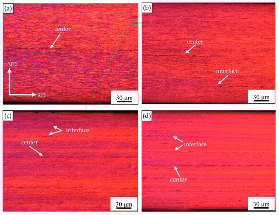 Figure 3 exhibits the polarized light images of the ARB-processed sheets after one, two, four, and six cycles. After one cycle, the 1060 aluminum alloy sheets exhibited satisfactory welding, illustrating successful interlayer bonding achieved during the ARB process. Grains in the sheets were stretched along the rolling direction (RD) and refined. With increasing ARB cycles, the grains became more elongated in the RD and developed into lamellar microstructures. The interface from the previous rolling pass became nearly indistinguishable, suggesting that effective bonding was achieved by the ARB process.