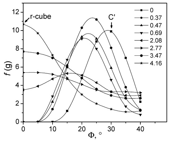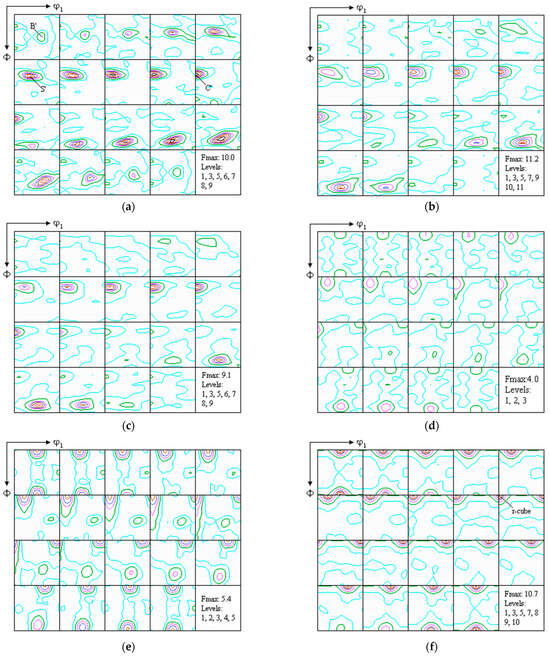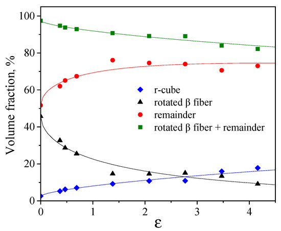 The volume fractions of the r-cube and rotated β fiber were calculated and are shown in Figure 11, offering a more detailed quantitative understanding of these components during shear deformation. The changes in the volume fractions of the rotated β fiber and r-cube orientations can be described as follows:
