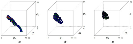 Figure 7 shows the intensity of components on the rotated β fiber as a function of φ2. The rotated β fiber was unstable during shear deformation, and overall orientations on the rotated β fiber indicated a decrease compared to the initial sample. The components’ intensity first decreased rapidly in the early deformation stage, followed by a slower decline. The B’ orientation intensity decreased to 0 at the accumulated true strain of 0.37. The S’ orientation intensity decreased rapidly with an increasing accumulated true strain, while the C’ orientation intensity decreased gradually.