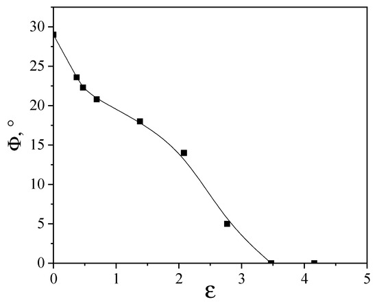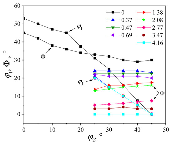 To precisely ascertain the variation in the rotated β fiber, the position of maximum intensity in different sections of φ2 = constant, i.e., φ1 and Φ as a function of φ2, was plotted as shown in Figure 6. Since the B’ component disappeared quickly in the early deformation stage, only the position of maximum intensity located in the range of φ2 = 25° to 45° could be presented. As the accumulated true strain increased, the maximum intensity position gradually changed from initial rotated β fiber to the r-cube orientation. Notably, φ1 values in different φ2 sections decreased slightly with an increasing accumulated true strain, while the Φ value decreased gradually to 0°.