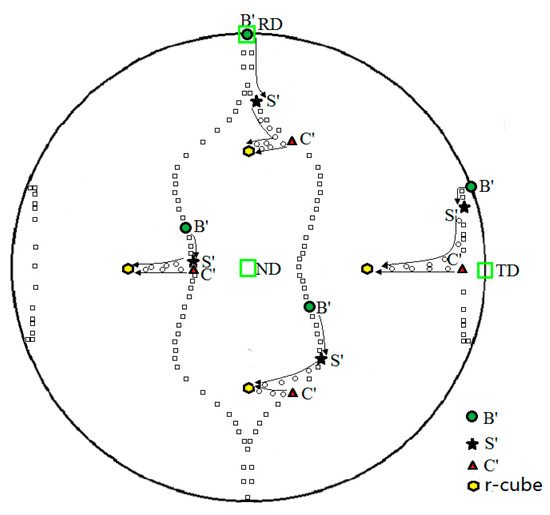 To elucidate the lattice rotation of these orientations in a more detailed way, the lattice rotation from the initial B’, S’, and C’ orientations to the stable end r-cube orientation are depicted in Figure 10 in a (1 1 1) pole figure, featuring one of the symmetrical rotation paths. It is observed that the B’ orientation moved along the skeleton of the initial rotated β fiber to the S’ orientation, while the C’ orientation moved along the TD axis to the r-cube orientation. The S’ orientation to the r-cube orientation rotation path slightly deviated from the C’ orientation.