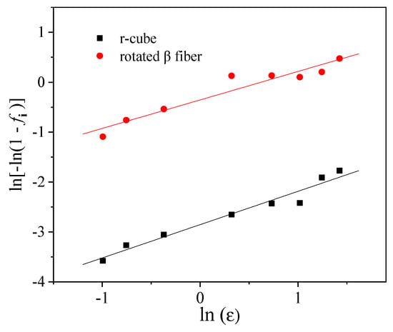 ni denotes the strain exponent corresponding to the r-cube and rotated β fiber, while ki is an empirical constant. The experimental data were fitted into Equation (2) through plotting versus ln ε, allowing for the determination of ki and ni values, as illustrated in Figure 12. The ki and ni values, along with the correlation coefficients (r), are tabulated in Table 1. Since the variation in the r-cube component volume fraction was identical to the combined volume fraction variations in the rotated β fiber and remainder components, the value of can be calculated through the utilization of the ki and ni values of the r-cube component. The subsequent formulae could be derived as follows on the basis of Equations (1) and (2):
