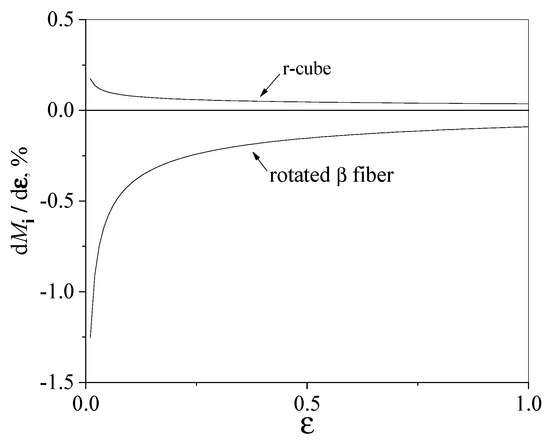 Derivative of r-cube and rotated β fiber volume fractions as function of accumulated true strain.