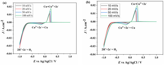 First, the electrochemical behavior of solutions containing different concentrations of Cu2+ was investigated using the CV technique. Cu2+ reduction can occur in either one step or two steps, depending on the solvent type and ambient conditions [23,26,41]. In the two-step reduction process, Cu2+ is first reduced to Cu+ according to Equation (1), and then, Cu+ is further reduced to Cu according to Equation (2):