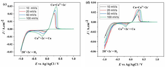 CV graphs of different concentrations ((a) 0.5, (b) 0.75, (c) 1.5, (d) 4.5 g/L) of Cu2+ at different scan rates.