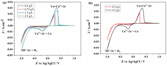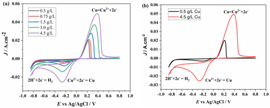 CV of (a) different concentrations (0.5, 0.75, 1.5, 3, 4.5 g/L) of Cu2+ and (b) 0.5 and 4.5 g/L of Cu2+ at the GC electrode.