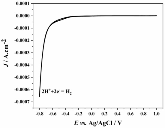 The pH of the 1.5 g/L Ni2+ solution was adjusted to 1, and the solution was analyzed within the potential range of −0.8 V to 1.0 V. The voltammetry graph obtained is shown in Figure 5. It can be seen from Figure 5 that Ni2+ reduction did not occur, and H+ reduction began at −0.7 V [25]. The absence of an oxidation peak in the CV graph indicates that Ni2+ reduction does not take place and that all observed reduction peaks correspond to H+ reduction.