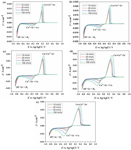 CV diagrams of solutions containing different concentrations of Cu2+ ((a) 0.5, (b) 0.75, (c) 1.5, (d) 3, (e) 4.5 g/L) and fixed 1.5 g/L of Ni2+ at different scan rates.