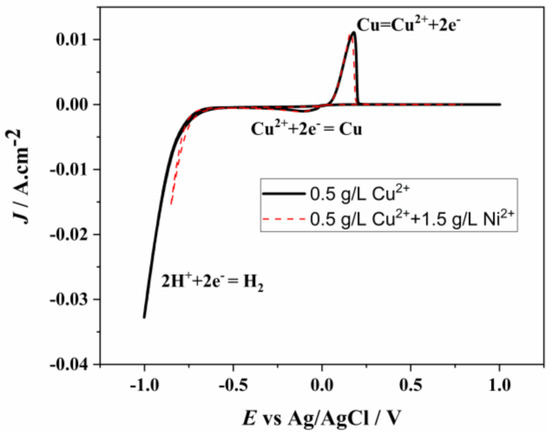 CV graphs of the solutions prepared at the concentrations listed in Table 2 are shown in Figure 6. From these graphs, it is evident that Ni2+ reduction does not occur, while H+ reduction takes place at −0.70 V [25]. The Cu2+ reduction and oxidation peak values are approximately the same as those observed in the solution containing only Cu2+. The reduction of Cu2+ to Cu occurs at −0.15 V, while the oxidation of Cu to Cu2+ occurs at 0.17 V.
