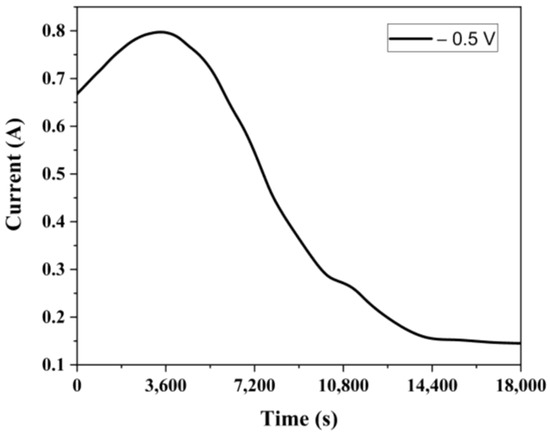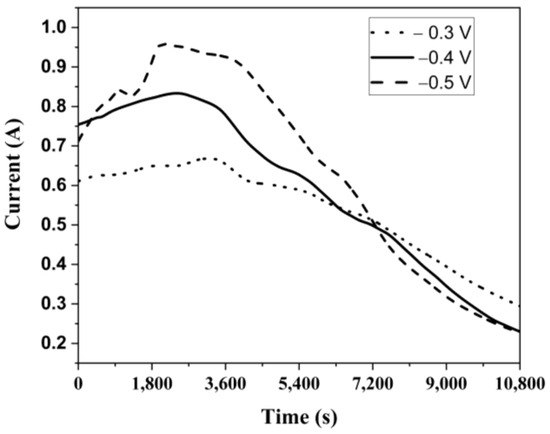 After determining the oxidation and reduction conditions at different concentrations and pH values using CV, potentiostatic separation experiments were conducted at −0.3 V, −0.4 V, and −0.5 V cathode potentials. Initially, experiments were performed at different potentials for a fixed duration of 3 h. Figure 9 shows the time-dependent current variation for these experiments. Similarly, the current initially increased from 0 to a peak value for each potential and then gradually decreased over time to the residual current level. This is likely due to the continuous consumption of Cu2+ ions in the solution over time, leading to a decrease in their concentration. As clearly shown in Figure 9, the highest current value was observed at the highest potential, as expected, while the current decreased with decreasing potential.