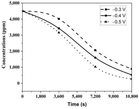 The variation in Cu2+ concentrations in the solution over 3 h at different potentials is shown in Figure 10. The figure indicates that the Cu2+ content decreased proportionally with the applied potential each hour, with the lowest Cu2+ concentration recorded at 140 ppm after 3 h at −0.5 V. These experiments confirmed that Ni2+ reduction did not occur, as indicated by the CV analyses, and the Ni2+ concentration remained constant at 1.5 g/L across all potentials.