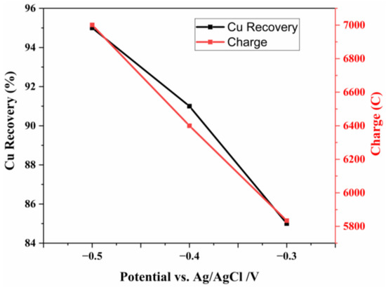 Figure 11 shows the copper recovery and charge values at different potentials. The lowest copper recovery was 80% at −0.3 V, while the highest recovery reached 94% at −0.5 V. As the potential increased from −0.3 V to −0.5 V, the charge increased from 5834 to 7001.