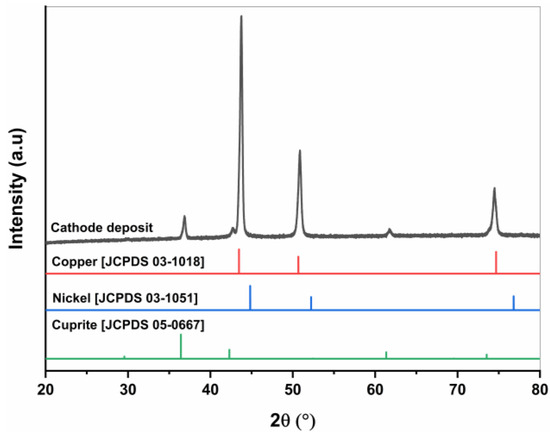 The phases present in the cathode-deposited metal were analyzed using XRD techniques. Figure 14 shows the XRD pattern of the cathode products. The diffractogram reveals two distinct phases: Cu and Cu2O. The Cu2O phase is believed to have formed during the drying process of the cathode products. In the XRD analysis, no Ni-containing phases were detected, which aligns with the ICP results. Djouani et al. also studied potentiostatic Cu-Ni separation using the classical two-electrode system and observed a small amount of the Cu2O phase, similar to our study [23].