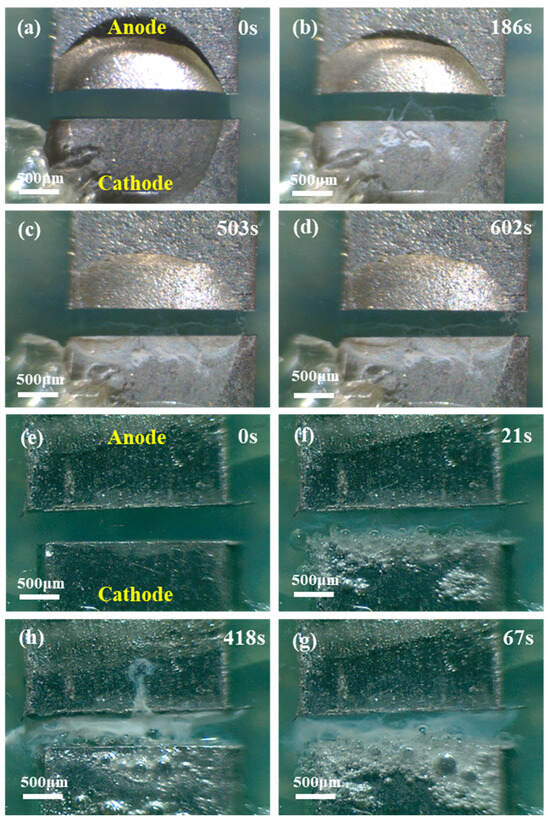 Figure 3 shows the in situ observation of the ECM phenomenon occurring in the Sn1.0Ag solder in the de-energized 0.01 M NaCl droplet. Figure 3a shows the initial state without energization, with a spacing of 0.5 mm between the two Sn1.0Ag solder electrodes and a drop of 5 μL in volume with a concentration of 0.01 M of the NaCl solution in the middle. After being energized for a period of time (73 s), a small number of bubbles would be generated at the end face of the cathode, and a small amount of white precipitate would be generated in the middle of the two electrodes, as shown in Figure 3b. As the energization time continued, after about 94s, dendritic crystals precipitated at the cathode end face (Figure 3c) and grew toward the anode. Eventually, after 131 s, the dendritic crystals bridged the cathode and anode together to form a short circuit (Figure 3d).