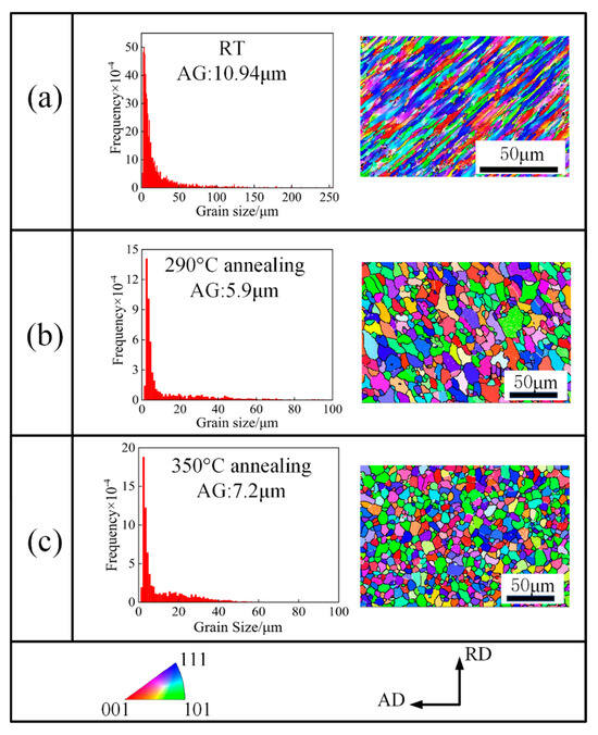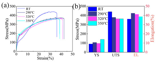 - The EL is the first to increase and then decrease with the increase in the annealing temperature. The mechanical properties of the specimen at 290 °C annealing temperature are the best, with a yield strength and ultimate tensile strength of 106.22 MPa and 378.55 MPa, respectively, and the EL is 42.43%.