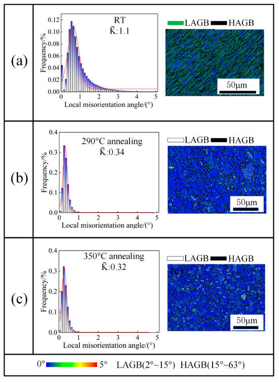 - After annealing, 5A06 aluminum alloy is transformed from stronger {221}<1-22> and {111}<3-41> textures to recrystallized texture (Cube{001}<100> and R-CubeND{001}<110>). The annealing process promotes grain recrystallization, weakening the texture strengthening effect induced by plastic deformation and decreasing dislocation density. The percentage of recrystallized grains at 350 °C was 90.8%.
