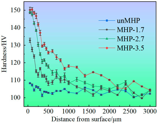 Generally, the depth of the hardened layer correlates with impact energy [25,26]. MHP-1.7 showed a rapid decrease in hardness with increasing depth, approaching the level of the untreated specimen at 1400 μm, indicating a relatively shallow hardened layer. In contrast, MHP-3.5 maintained elevated hardness until approximately 2200 μm from the surface before declining to the hardness level of the unMHP specimen. MHP-2.7 exhibited intermediate characteristics, with a hardened layer depth of approximately 2000 μm.