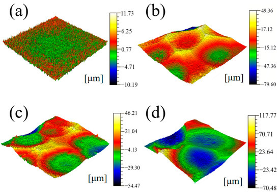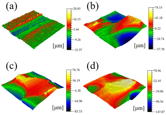 Figure 3 presents the 3D surface topography of the specimens under varying MHP treatment energies by confocal microscope images. The untreated specimen (Figure 3a) exhibits a relatively flat surface with minimal height variations, showing a maximum height difference of approximately 22 μm, indicative of the original machined surface condition. As shown in Figure 4, this conclusion can be evidenced by an average roughness (Ra) of 0.98 μm and an Rt value (maximum height difference) of 8.88 μm.