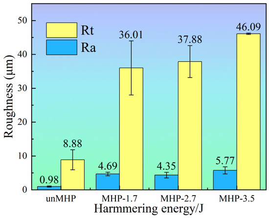 Upon MHP treatment, the surface underwent significant plastic deformation, characterized by distinctive crater-like features. Initially, the height differential increases with impact energy, as evidenced by surface deformation patterns exhibiting a height difference of approximately 180 μm at 1.7 J (Figure 3b), and the corresponding Ra and Rt values increased sharply to 4.69 and 36.01 μm, respectively, demonstrated the primary effects of the MHP process. However, when the impact energy increased to 2.7 J (Figure 3c), the surface morphology exhibited an unexpected reduction in height difference to around 100 μm, indicating a transition toward more uniform deformation patterns. This is accompanied by a decreased Ra value of 4.35 μm and a relatively stable Rt of 37.88 μm. It is important to note that while the height difference data were derived from individual confocal microscope images, the roughness values represented averages from five independent measurements. The observed reduction in surface roughness suggests an optimization of surface integrity, attributed to higher dislocation density induced by increased plastic deformation; such microstructural evolution subsequently inhibits further plastic deformation processes through the strain-hardening mechanism. With a further increase in impact energy (3.5 J), the surface roughness demonstrates a renewed upward trend, with the height difference reaching approximately 188 μm. As illustrated in Figure 3d, the morphological features are characterized by more distinct valley/peak configurations.