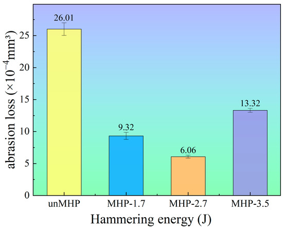 This non-linear wear behavior reveals the existence of an optimal window for hammering energy in relation to wear resistance. Moderate machine hammering effectively enhances wear resistance through multiple mechanisms, including surface hardening, optimization of residual stress distribution, and microstructural refinement [36]. However, excessive hammering energy can trigger detrimental effects, such as over-work hardening of the surface layer and the formation of microcracks and other microstructural defects, ultimately compromising the material’s wear resistance properties [37].
