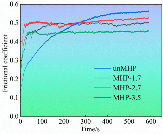 In contrast, MHP-1.7 demonstrated relatively stable friction behavior, with the friction coefficient oscillating around 0.5, suggesting that moderate machine hammering contributes to stabilizing tribological properties. Most notably, MHP-2.7 exhibited superior friction performance, characterized by both the lowest friction coefficient (approximately 0.45) and remarkable stability throughout the testing duration, displaying minimal curve fluctuations. These results indicate that the 2.7 J hammering energy induced optimal surface-strengthening effects, effectively suppressing severe frictional damage. However, when the hammering energy was further increased to 3.5 J, MHP-3.5 showed a slight elevation in friction coefficient, stabilizing at approximately 0.52, which correlates well with the previously observed wear volume trends.