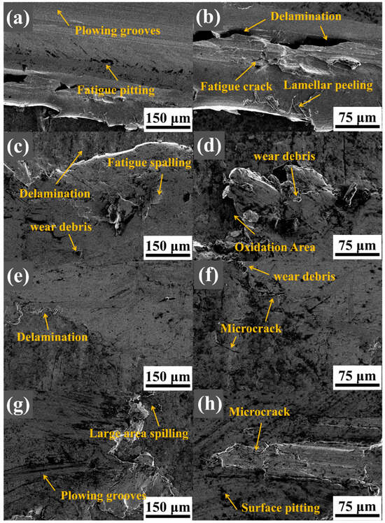 The unMHP exhibited severe composite wear characteristics with the most significant damage. Figure 8a shows prominent plowing grooves and fatigue pitting, indicating the simultaneous occurrence of abrasive and fatigue wear. Figure 8b reveals more complex damage patterns: lamellar peeling reflecting intense surface plastic deformation; fatigue cracks indicating cyclic loading-induced damage; and delamination resulting from the propagation and coalescence of surface and subsurface fatigue cracks. This synergistic effect of multiple wear mechanisms primarily stems from the untreated material’s relatively low surface hardness and fatigue resistance, leading to adhesion/peeling cycles during reciprocating friction and ultimately resulting in severe material loss. MHP-1.7 demonstrated notably mitigated surface damage, characterized by combined fatigue and oxidative wear. Figure 8c shows fatigue spalling and localized delamination, indicating persistent but significantly reduced fatigue damage compared to unMHP in both distribution and depth. Figure 8d reveals oxidation areas and wear debris, suggesting mild oxidative and abrasive wear. This improved damage pattern can be attributed to surface strengthening effects induced by machine hammering, enhancing both plastic deformation resistance and fatigue life. MHP-2.7 exhibited optimal wear resistance, predominantly displaying mild fatigue wear characteristics. Figure 8e shows only minimal surface delamination, indicating excellent surface integrity. The presence of limited microcracks and wear debris in Figure 8f suggests moderate fatigue damage processes. This remarkable performance enhancement can be attributed to several synergistic mechanisms: (i) formation of an optimal work-hardened layer significantly improving plastic deformation resistance, (ii) induced compressive stress fields effectively suppressing fatigue crack initiation and propagation, and (iii) refined surface microstructure enhancing overall wear resistance. MHP-3.5 reverted to severe composite wear characteristics. Figure 8g shows large-area spalling and plowing grooves, indicating significant adhesive and abrasive wear. The surface pitting and microcracks in Figure 8h reflect severe fatigue damage. This performance degradation suggests excessive hammering energy led to surface over-deformation and structural damage, potentially through excessive work hardening-induced embrittlement, increased surface microstructural heterogeneity, and deterioration of residual stress distribution.