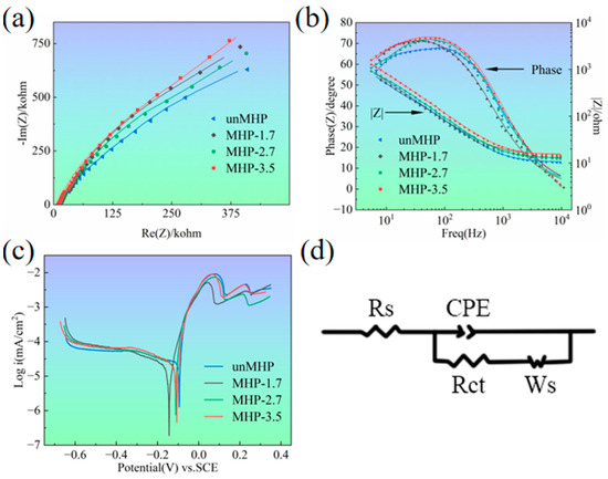 Electrochemical test analysis of different samples: (a) Nyquist diagram; (b) Bode diagram; (c) potentiodynamic polarization curves; and (d) equivalent circuit diagrams.