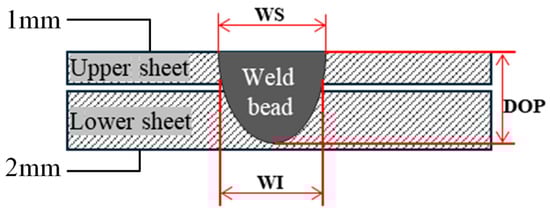 Points where the temperature reaches the liquidus (the melting temperature of the material, 1536 °C for the base steel) are used to define the molten pool dimensions. These dimensions directly influence the weld geometry. The key weld characteristics were the depth of penetration (DOP), measured from the top surface to the deepest point of the molten pool, ranging up to a maximum of 1.5 mm depending on laser power and welding speed; the surface bead width (WS), representing the width of the molten pool at the top surface, varying between 0.3 mm and 1.2 mm, influenced by welding parameters; and the interface bead width (WI), the width at the interface between the sheets, typically up to 2 mm, depending on the welding conditions. The values are shown schematically in Figure 1.