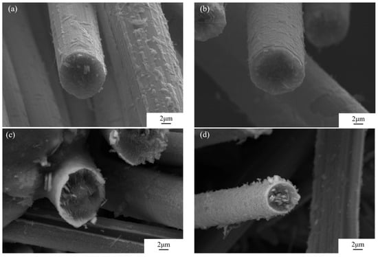 Figure 11 shows the fracture morphology of Ti-CF/Al specimens prepared using the CF with different coating thicknesses. As shown in Figure 11a, the CFs with coating damage were observed in the fracture surface of the TiC-CF/Al composite material prepared by coating with a holding time of 2 h. Due to the unevenness of the coating surface, the bonding strength between the CF and Al substrate is insufficient. Meanwhile, when the Al melt comes into direct contact with the CF, it is prone to the formation of brittle-phase Al4C3, which seriously damages the CF interface and becomes a crack source [,]. In the TiC-CF/Al composite material prepared by coating with a holding of 3 h, the bonding strength between the CF and Al matrix is high, and the overall composite exhibits a short pull-out fracture morphology. The formation of tearing ridges around the short pulled out fibers is consistent with the mechanisms of fiber debonding and fiber pull-out fracture []. The strength of the TiC-CF bonding interface exceeds the tensile strength that the TiC coating can withstand. In the process of resisting tensile deformation in composite materials, when the TiC-CF structure exhibits a core–shell structure, the crack source starts from the coating and leads to fracture, and the CF inside the shell will also fracture in weak areas. When TiC-CF achieves effective bonding, the shear effect at the coating interface can be effectively transmitted to the carbon fiber reinforcement [,]. In addition, CF reinforcements typically have a high stiffness, resulting in shear fracture when subjected to tensile failure [,].