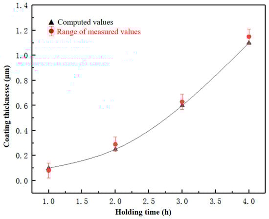 In the formula, D is the thickness of the coating and t is the holding time. As shown in Figure 4, the variation law of coating thickness between calculated and measured values of the TiC-CF coating with holding times can be observed. It can be found that with the extension of the holding time, the growth rate of the coating thickness on the surface of the CF gradually increases and follows a quadratic function. By comparing the theoretical and measured values, it was found that the calculated values fully conform to the variation law of the coating over time, and the theoretical and measured values are within the error range. The establishment of this formula will be convenient for later research on the relationship between coating thickness and time.