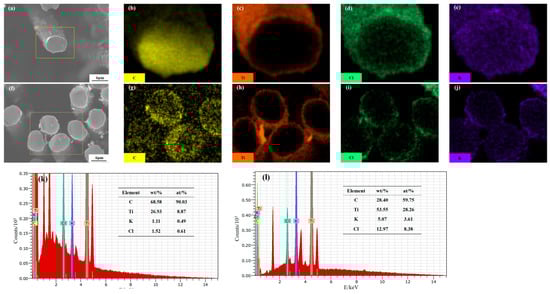 In order to further investigate the bonding strength between the TiC coating and CF, Figure 5 shows the EDS scan images of TiC-CF cross-sections after holding for 2 h and 3 h. After 2 h of holding, Ti is uniformly distributed on the surface of the CF. Based on Figure 3, there is no separation or layering at the joint, and the interface is clear, forming a core–shell structure. It can be observed that Ti penetrates into the interior of the interface layer, resulting in a blurred distribution of the Ti and C interfaces. Combined with Figure 3, this indicates good interface bonding between the TiC coating and CF. According to Figure 5k, it can be seen that KCl, as the medium for the molten salt reaction, accounts for less than 1% of the particles attached to the coating surface. This indicates that water washing is an effective method for removing KCl from TiC-CF materials that have been maintained for 2 h. After 3 h of holding, a small amount of flocculent structures appeared on the surface of the TiC-CF. Based on Figure 5h, it can be confirmed that these flocs contain unreacted Ti. Due to the increased roughness of the TiC surface and the appearance of flocs, the molten salt medium tends to solidify in the pits on the coating surface, with the proportions of K and Cl atoms reaching 3.61% and 8.38%, respectively (as shown in Figure 5l).