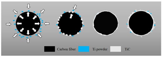 Metal-based composite materials have become key materials required in many industries due to their excellent performance []. Among numerous metal-based composite materials, Al-based composite materials [] have developed rapidly due to their lightweight, high specific strength, low thermal expansion coefficient, good wear resistance, and corrosion resistance and are widely used in key parts of automobiles such as roofs, doors, and floorboards due to their excellent lightweight and high-strength characteristics. Similarly, this material is widely used in the skin, wing beams, wing boxes, and other structures of aircraft [,]. In addition, in the field of precision component manufacturing for electrical equipment and medical devices [], carbon fiber aluminum-based composite materials have also demonstrated their unique advantages. Their lightweight and high-strength characteristics not only significantly reduce the weight of the shell, but also greatly increase the effective load of the system []. The reinforcing phases in Al-based composite materials are mostly hard ceramic particles, whiskers, or fibers. Compared to whisker- or particle-reinforced aluminum matrix composites, carbon fiber-reinforced aluminum matrix (CF/Al) composites have a series of excellent properties, such as high specific strength, high specific modulus, and good dimensional stability, making them an important direction for the research and development of aluminum matrix composites [,,]. However, during the preparation process of composite materials, it was found that there is a significant wetting angle between the carbon fiber (CF) and aluminum alloy []. At higher temperatures, although there is some improvement in wettability, carbon fibers react with aluminum to form brittle phase Al4C3, which will affect the formability and properties of the composite material [,]. Through the research of many scholars, it has been found that metal coatings on the surface of carbon fibers can not only effectively improve the wettability of the fibers, but also suppress interfacial reactions [,]. Hajjari et al. [] found that the presence of a Ni coating on CF significantly improves the tensile strength of composite materials. However, the interface bonding between the CF and Ni coating is not strong enough [] and is unable to maintain continuity under a high pressure, resulting in coating separation. Rohatgi et al. [] found that Ni coatings belong to mechanical bonding, and the coefficient of the thermal expansion between Ni coatings and fibers varies greatly, resulting in weak bonding and easy coating detachment. Zhou et al. [] confirmed the effectiveness of Cu-coated carbon fibers in improving the surface properties of metal substrates. However, the reaction between copper and aluminum forms the Cu2Al brittle phase, which significantly damages the mechanical properties of the composite material []. In the preparation process of CF/Al composites, metal coatings, such as nickel and copper, will diffuse into the Al melt in a solid solution form, which will affect the chemical composition of the substrate []. Tang et al. [] conducted extensive research on the interface bonding between carbon materials and metal substrates and found that coating the surface of carbon materials with metal elements that can react with carbon elements to form stable carbides can greatly improve the interface bonding strength between carbon fibers and metal substrates. Si et al. [] used a diffusion model to investigate the interfacial stability between Ni-coated, Cu-coated, and TiC-coated carbon fibers and the matrix. Only the decomposition of the outermost TiC coating was observed in CF/Al composites prepared using TiC coatings formed by the reaction between Ti and CF. The result showed that, compared to Ni and Cu coatings, the TiC interface may have a higher chemical bonding strength and thermal stability, so only the outermost TiC coating decomposes during preparation, while the inner coating remains stable. The bonding strength between the carbon fiber and matrix is moderate, which will be beneficial for improving the mechanical properties of TiC-coated carbon fiber Al-based composites. Among numerous coating materials, TiC coatings prepared by the reaction between a Ti element and carbon fiber have the advantages of a high melting point, high strength, high hardness, good thermal expansion coefficient, and chemical stability []. Dong et al. [] found that TiC has good chemical compatibility with the Al matrix, and a TiC coating can improve the wettability between the CF and Al matrix. Park et al. [] found that there is a strong bonding force between TiC and carbon fiber, and a TiC coating can serve as a diffusion barrier layer between the carbon fiber and aluminum matrix, effectively preventing the occurrence of interfacial chemical reactions, inhibiting the formation of the brittle Al4C3 phase.