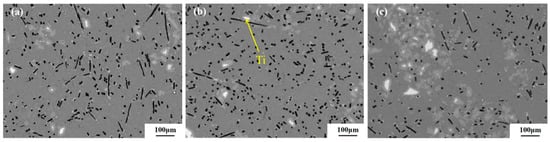 When the holding time during the molten salt reaction is only 1 h, TiC fails to completely encapsulate the CF, which is not conducive to the performance strengthening of TiC-CF/Al composite materials. The microstructure of TiC-CF/Al composite materials prepared by the vacuum pressure infiltration method using TiC-CF prepared under holding times of 2 h, 3 h, and 4 h is shown in Figure 7. The vacuum pressure infiltration technology ensures the effective dispersion of TiC-CF in the matrix []. The holding time for the molten salt reaction was extended from 2 h to 4 h, and the CF in the composite matrix was evenly distributed. However, due to the dissolution of residual Ti particles on the coating surface in the Al matrix, the aggregation of white, block-shaped Ti particles in the TiC-CF/Al composite matrix increased, and a dark-white Al-Ti intermetallic phase was formed [].