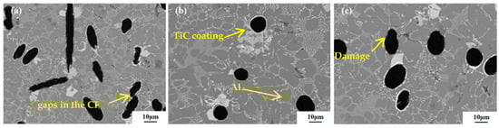 Morphology of TiC CF/Al composites prepared using coatings of different thicknesses at high magnification: (a) holding for 2 h; (b) holding for 3 h; and (c) holding for 4 h.
