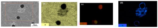 As shown in Figure 8a, when the holding time of the molten salt reaction is 2 h, there is no significant gap at the junction between the TiC-hhhCF and Al matrix, indicating that the wettability between the CF and Al matrix has been enhanced. However, local damage occurred to the TiC coating, resulting in an incomplete surface morphology of the CF and a blurred interface at the direct contact with the Al substrate. The interface reaction may have generated Al4C3 []. This indicates that although the coating obtained after 2 h of holding significantly improves the wettability of the CF, its strength is affected due to the thin coating, and coating damage limits the optimization of its overall performance. When the holding time of the molten salt reaction reaches 3 h, the CF distribution inside the composite material is uniform. And the CF maintains its original shape, at which point the interface reaction has significantly weakened. In the preparation process of CF/Al composite materials, due to the high melting point of the Ti element, its diffusion ability in the Al melt is limited during the rapid preparation process. As a result, the Ti element is often concentrated near the CF surface in the composite material, forming a rich Ti phase, as shown in Figure 9. The Ti element that segregates near the CF in the matrix will supplement the detached coating, thereby suppressing the formation of the Al4C3 compound []. This constitutes the second protective barrier against the CF. However, when the holding time of the molten salt reaction was increased to 4 h, significant differences in the thickness of TiC coatings on different fiber surfaces were observed, and an uneven coating was observed on the surface of the same CF, with local damage, resulting in gaps in the CF.