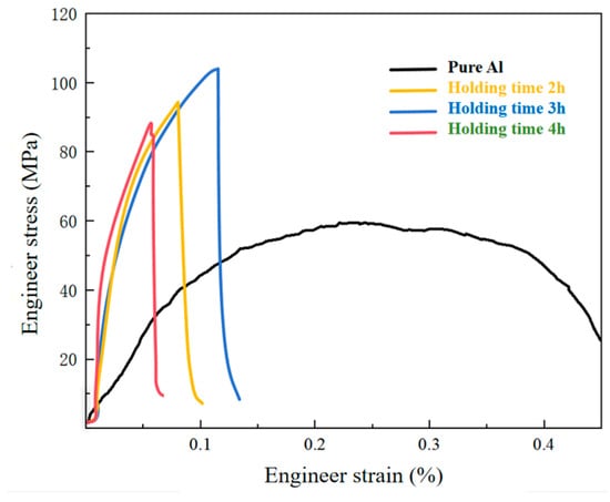 Table 2 and Figure 10 show the stress–strain curves of the pure aluminum matrix and TiC-CF/Al composite material. After retaining three valid values for each group, we took the average and plotted the tensile strength curve. Pure Al exhibits a high toughness, low tensile strength, and good elongation. The measured tensile strength of pure Al is 60.30 MPa.