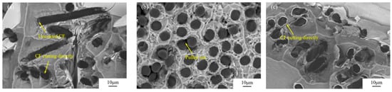 Morphology of TiC-CF/Al composite materials prepared using coatings of different thicknesses: (a) holding for 2 h; (b) holding for 3 h; and (c) holding for 4 h.