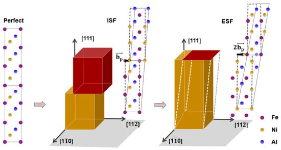 As shown in Figure 1, the calculation schematic for Generalized Stacking Fault Energies (GSFEs) [35] illustrates the entire computational process. When performing GSFE calculations, the model dimensions are first determined based on the lattice constants corresponding to different alloy compositions. The orientations of the three-dimensional spatial coordinate axes x-, y-, and z- of the model are set as [11], [10], and [111], respectively. Periodic boundary conditions are applied along the x- and y-axes to simulate an infinite model. In contrast, a free boundary condition is applied along the z-axis to allow for free expansion in the z-direction. The model is divided into two parts: the lower part remains fixed, while the upper part undergoes slip along the [11] direction on the (111) plane. The displacement of each slip corresponds to the length of a Burgers vector (bν), which is defined as a0/6<112>, where a0 is the lattice constant. Specifically, a displacement of one bν produces an intrinsic stacking fault (ISF), while a displacement of two bν results in an extrinsic stacking fault (ESF). To evaluate the effect of the slip deformation on the alloy, the stacking fault energy after defect formation is calculated using the formula , where represents the system energy after the formation of the stacking fault, is the initial system energy, and A is the area of the slip plane. This calculation provides insight into the influence of the slip process on the properties of materials with different compositions, offering a theoretical basis for further optimization of alloy compositions.