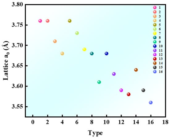 Under the condition that the Fe content is more significant than 60%, the contents of Ni and Al elements were adjusted, resulting in 16 different compositions, with Fe: 0.6–0.9, Ni: 0.01–0.2, and Al: 0.01–0.39. The test results of the lattice constants for each composition [39] are shown in Figure 2. The x-axis “Type” corresponds to the composition numbers listed in Table 1.