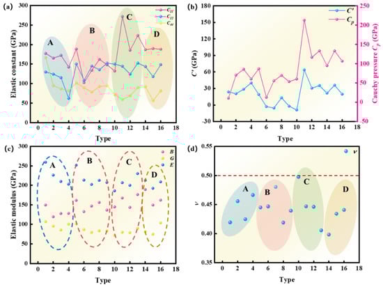 Relevant values obtained from MD. (a) Elastic constants C11, C12, and C44; (b) C′, Cauchy pressure Cp; (c) Elastic modulus (B, E, G); (d) Poisson’s ratio v.