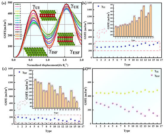 Figure 4 shows the GSFE (Generalized Stacking Fault Energy) obtained by atomic displacements in the [11] direction. Figure 4a displays the GSFE curves for the 16 compositions, where green atoms represent the FCC structure and red atoms represent the HCP structure. Deformation starts with the intrinsic stacking fault (ISF), followed by the extrinsic stacking fault (ESF). Upon examining the curves, the maximum values correspond to the dislocation critical nucleation energy γUI and the energy required for pre-existing stacking fault slip γUE. In contrast, the minimum values correspond to the energy required to form the intrinsic stacking fault γISF and the energy required to form the extrinsic stacking fault γESF. Figure 4b,c represent γUI and γISF for the 16 compositions, respectively. As shown in the figures, with the increase in Fe and Ni content and the decrease in Al content, γUI generally shows a monotonic increase, whereas γISF shows a monotonic decrease, indicating that as Fe content increases and Al content decreases, more energy is required to form the ISF. Figure 4d shows γUE and γESF for the 16 compositions. It can be observed that with the increase in Fe and Ni content and the decrease in Al content, γUE exhibits a fluctuating trend, while γESF shows a monotonic decrease. The results in Figure 4 suggest that SFE can serve as a criterion for evaluating the effect of chemical composition on the deformation mechanisms of FCC alloys.