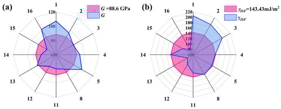Therefore, a criterion can be defined where the size of the Generalized Stacking Fault Energy (GSFE) is used to characterize the plasticity of FeNiAl alloys, and the size of the shear modulus (G) is used to characterize their strength. The lower the GSFE and the higher the G, the better the combination of strength and plasticity, leading to superior alloy performance. To effectively select the composition of FeNiAl alloys with the optimal strength–plasticity combination and better understand the influence of composition on mechanical properties, this study will utilize G and GSFE to assess the alloy’s strength and plasticity.