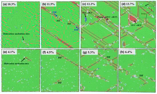 The simulation tensile deformation process of Fe90Ni9Al and Fe70NiAl29 alloys. Fe90Ni9Al shows (a) 10.3%, (b) 11.5%, (c) 12.2%, and (d) 13.7% at different strain levels. Fe70NiAl29 shows (e) 4.1%, (f) 4.5%, (g) 5.3%, and (h) 6.4% at different strain levels.