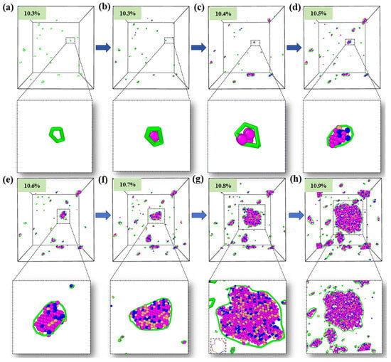 Analysis of dislocation loop evolution of Fe90Ni9Al in the process of strain of 10.3–10.9%: (a) 10.3%, without atoms (b) 10.3%,with atoms, (c) 10.4%, (d) 10.5%, (e) 10.6%, (f) 10.7%, (g) 10.8%, (h) 10.9%, the green is Shockley partial dislocation, the red atom is Fe atom, the blue atom is Al atom, and the yellow atom is Ni atom. The red fragment is the screw dislocation fragment, and the blue fragment is the edge dislocation fragment.
