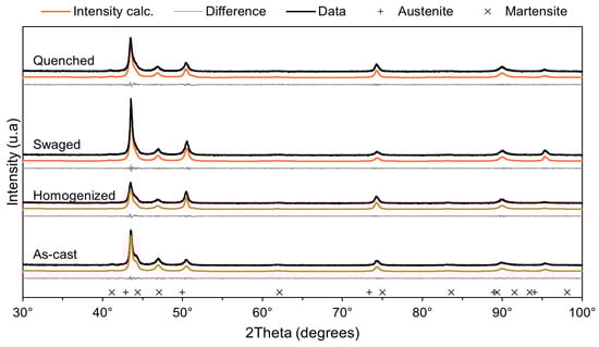 XRD refined patterns of the Fe–35Mn alloy for conditions as-cast, homogenized, swaged and quenched. The black line represents the experimental XRD pattern. The orange line represents the pattern calculated by Rietveld refinement. The gray line at the bottom of the curve presents differences between the experimental and calculated intensities. Markers + and × indicate XRD pattern of the austenite (ICSD 631730) and martensite (ICSD 103519) phases, respectively.