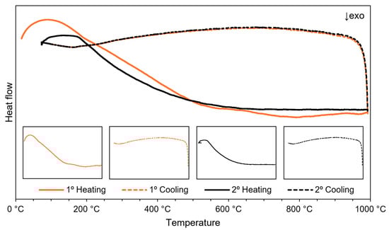 Thermogram of the Fe–35Mn alloy sample (quenched condition) on heating and cooling, measured with DSC from room temperature to 1000 °C.