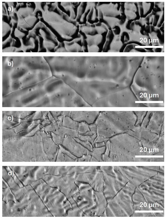 Before microstructural analysis, samples that were previously used for XRD were first ground with SiC sandpapers up to 1500 grit, polished with 0.25 µm diamond paste, and ultrasonically cleaned with ethanol to ensure the removal of abrasives from the surface. A 5% Nital solution was used as an etchant, and the microstructure of the alloy was examined using an Epiphot 200 optical microscope (OM) with reflected light (Nikon, Tokyo, Japan). The average grain size was measured from the obtained optical micrographs using open source software for processing and analyzing scientific images, ImageJ 1.53t version. Grain size measurements were based on the longest straight line segment inscribed within each grain.