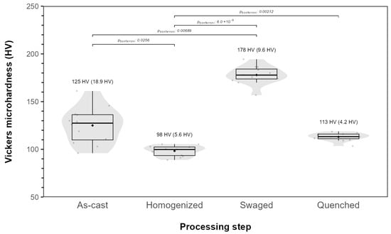 The Shapiro–Wilk test indicated that all groups followed a normal distribution (As-cast, p = 0.977; swaged, p = 0.870; homogenized, p = 0.444; quenched, p = 0.514). However, Levene’s test showed heterogeneity of variance among the groups (p = 5.52 × 10−5), and two outliers were observed: one in the swaged group (157 HV) and another in the quenched group (104 HV). To compare the groups, the non-parametric Kruskal–Wallis test was applied, revealing significant differences in Vickers microhardness across the groups (χ2(3) = 37.9; p = 2.99 × 10−8; η2ₕ = 0.793). Dunn’s test with a Bonferroni correction was performed as a post hoc analysis, demonstrating statistically significant differences between the groups: As-cast (median = 127 HV; IQR = 26.4) differed from swaged (median = 178 HV; IQR = 10.4 HV) (p = 2.56 × 10−2) and homogenized (median = 99.8 HV; IQR = 8.95 HV) (p = 6.89 × 10−3), and swaged differed from both homogenized (p = 6.0 × 10−9) and quenched (median = 113 HV; IQR = 4.85 HV) (p = 6.89 × 10−3 and p = 2.12 × 10−3).