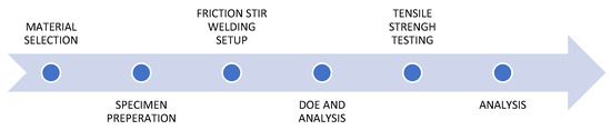In this study, friction stir welding was employed to join aluminum sheets of 2 mm thickness using the AA1050 and AA5754 alloys. This section aims to describe the methodological approach that the authors used in order to design the experiments and obtain robust results. As shown in Figure 1, the materials were selected, followed by specimen preparation. Friction stir welding setup and DOE are two inextricably linked steps, as the design of the experiments is dependent on the setup. In the end, tensile strength measurements were taken and an analysis of the results was produced to reach an insightful conclusion of the study.